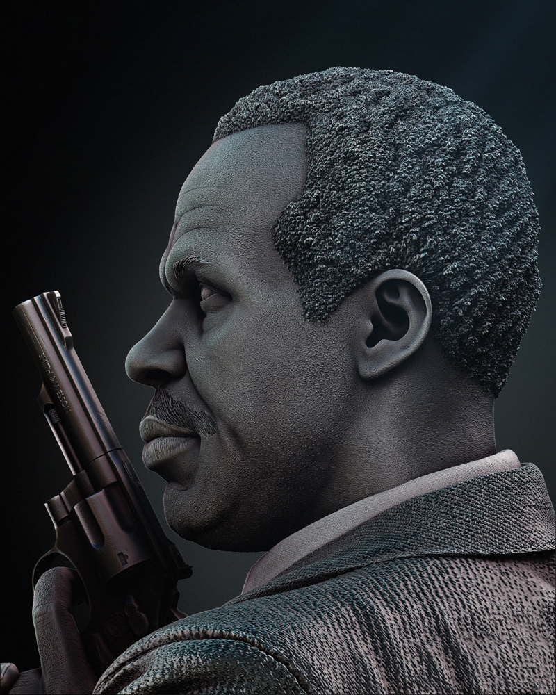 The sculpture captures Roger Murtaugh in a poised and ready stance, reflecting his experienced and cautious nature. He might be depicted holding his signature revolver, in a defensive posture, or engaging in a tactical maneuver, showcasing his seasoned skills as a detective.